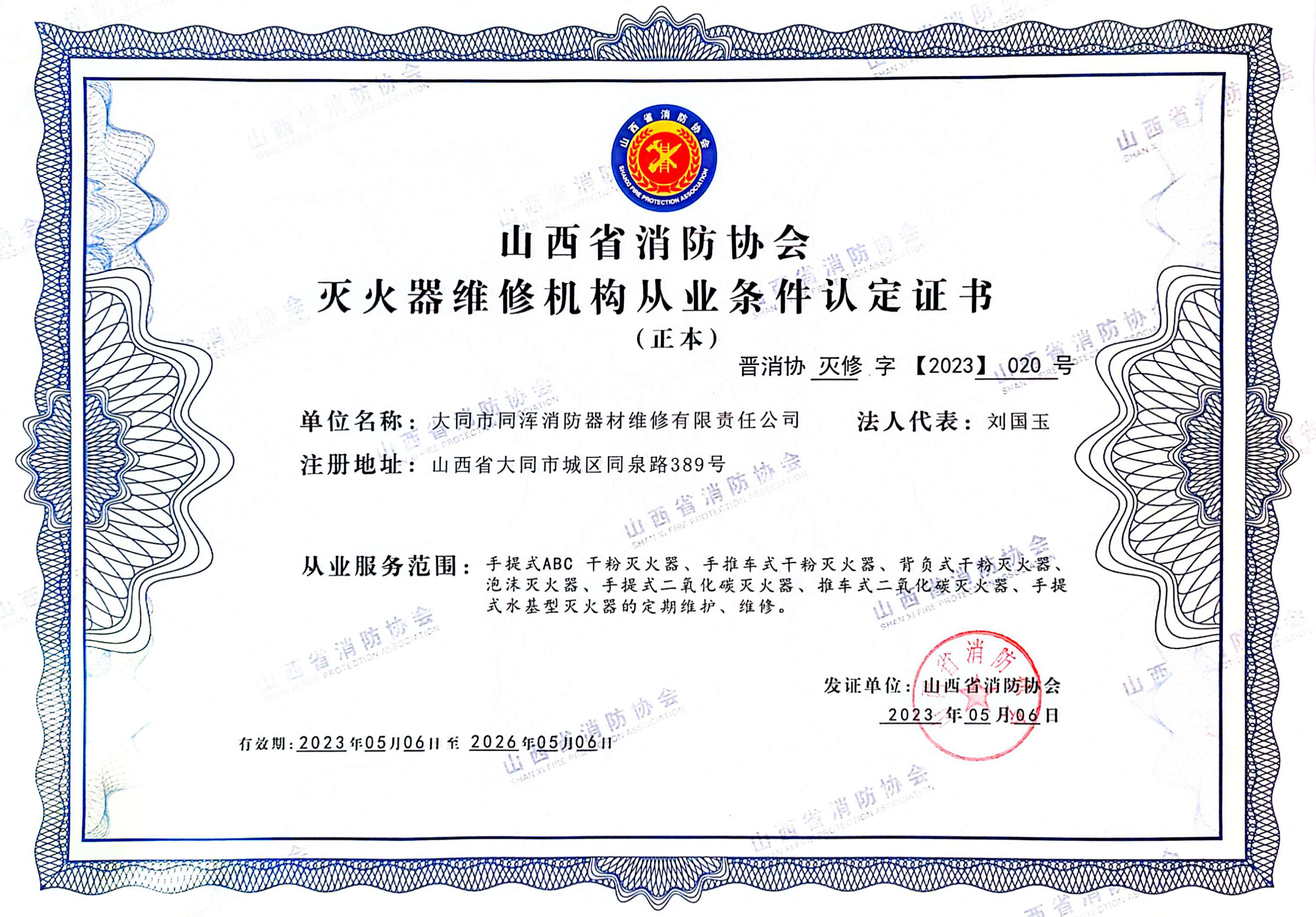 大同市同渾消防器材維修有限責任公司,位于大同市同泉路389號,始建于2000年,是公安部消防局定點銷售和維修的企業,歷經多年的創建、發展和拼搏,現有多家消防器材廠商供應我公司,并有現代化維修設備,標準的廠房,嚴格的管理,優良的設備,良好的服務并受到各行各業的好評??偨浝韯駠栏窆芾?,嚴格要求,精益求精,認真負責,帶領團隊熱烈歡迎各界朋友顧客光臨。